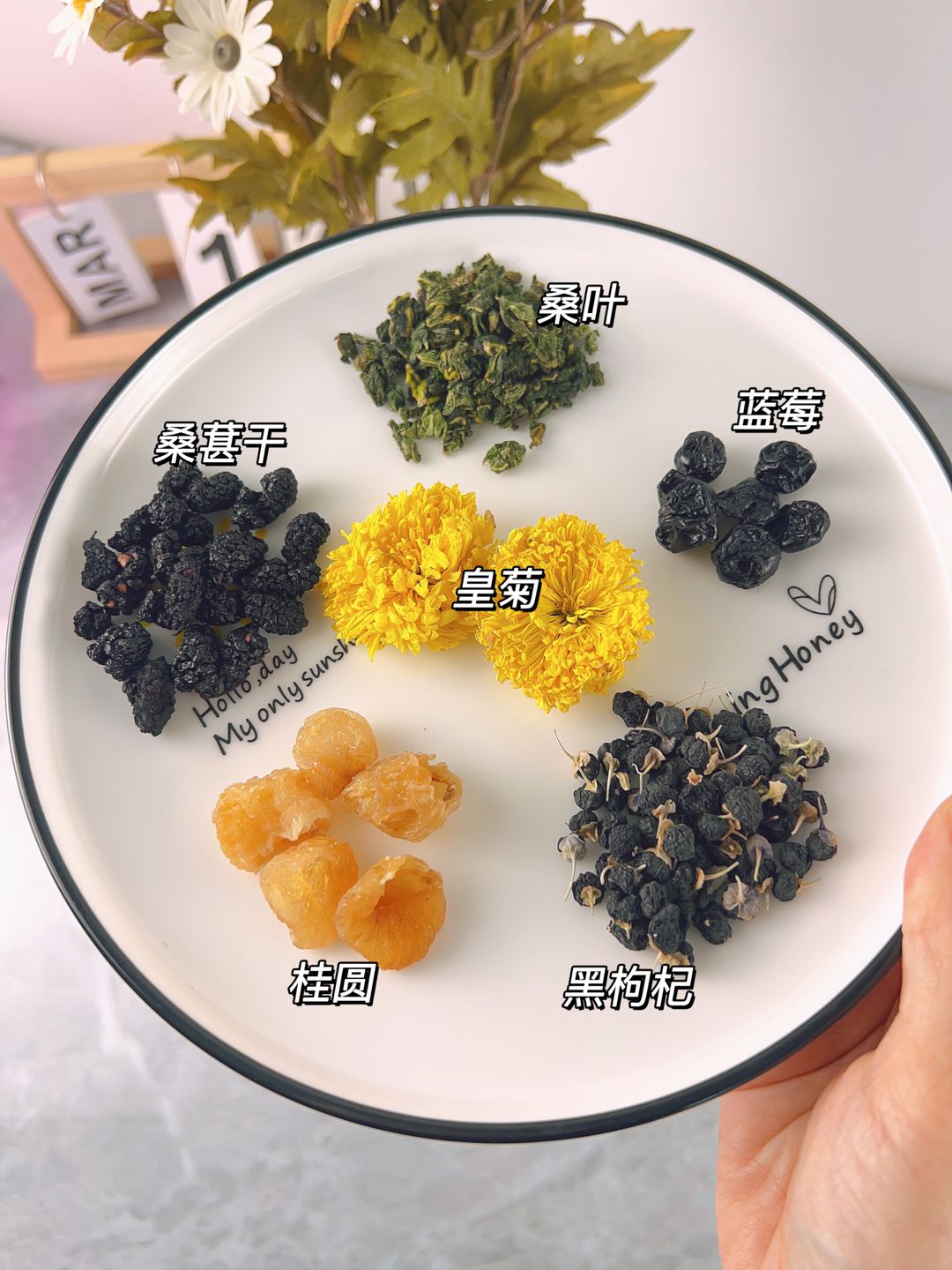 配料:桑叶 蓝莓干 黑枸杞 桑葚干 黄菊 桂圆肉