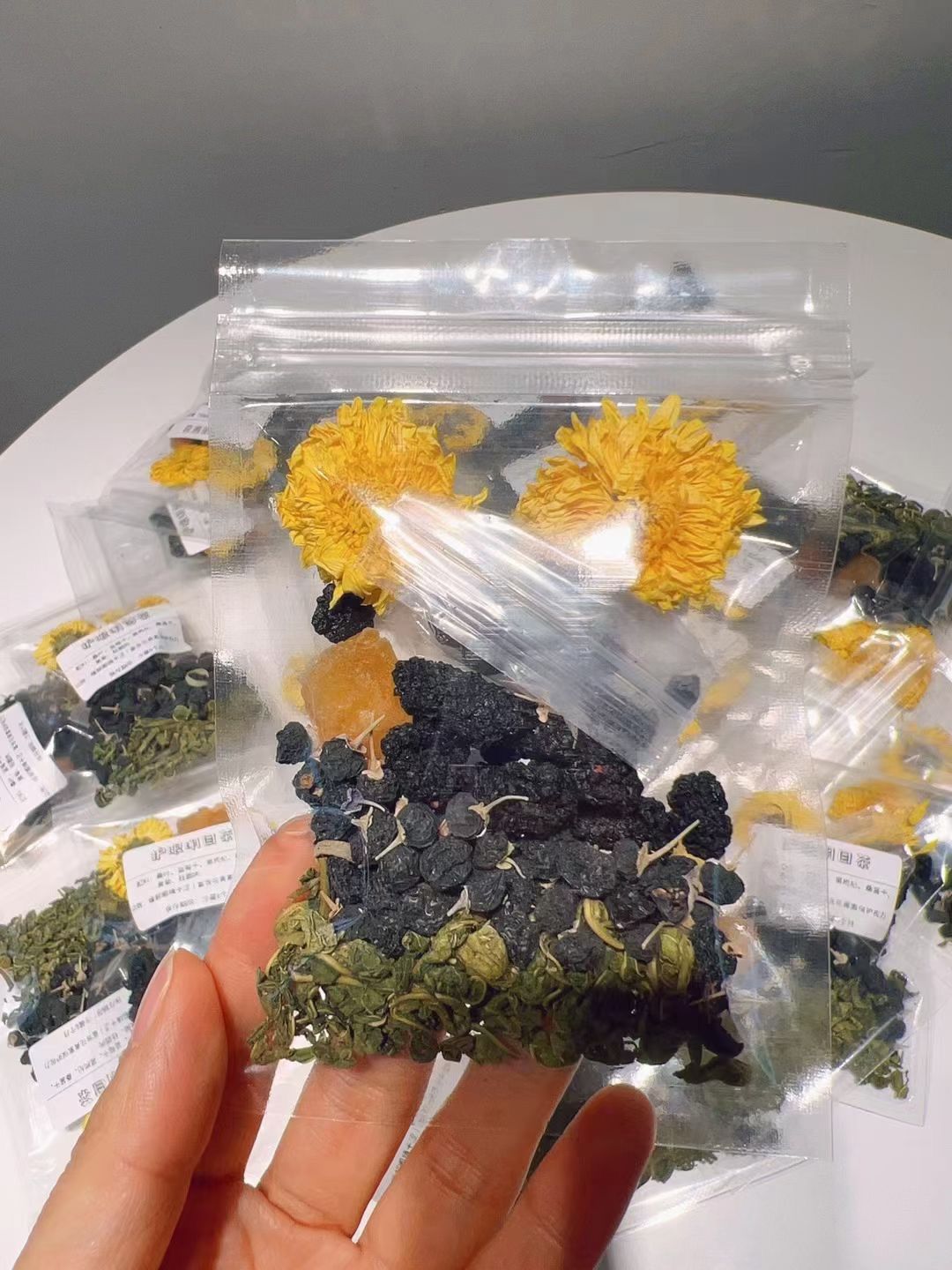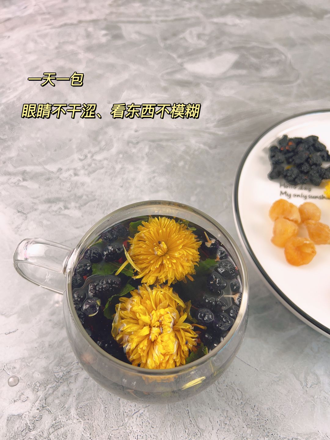 Ingredients: Mulberry leaves, dried blueberries, black goji berries, dried mulberries, yellow chrysanthemum, and longan flesh